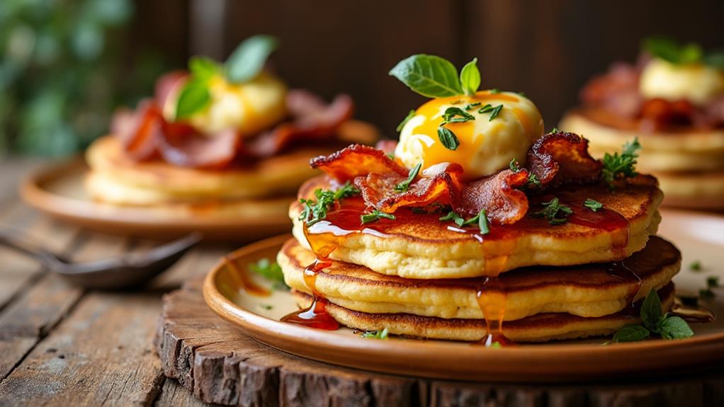 Transform your pancake experience by pairing syrup with savory flavors. Try drizzling maple syrup over bacon for a blissful sweet and salty combo, or improve roasted vegetables like Brussels sprouts and sweet potatoes. Pair sharp cheddar or tangy blue cheese with syrup for an unexpected treat. Sweeten up savory oatmeal with a bit of maple, topped with sautéed greens and a poached egg. For an elegant twist, use maple syrup as a glaze for salmon or chicken dishes. These combinations raise everyday meals into gourmet experiences. Uncover more ways to make your savory dishes standout.