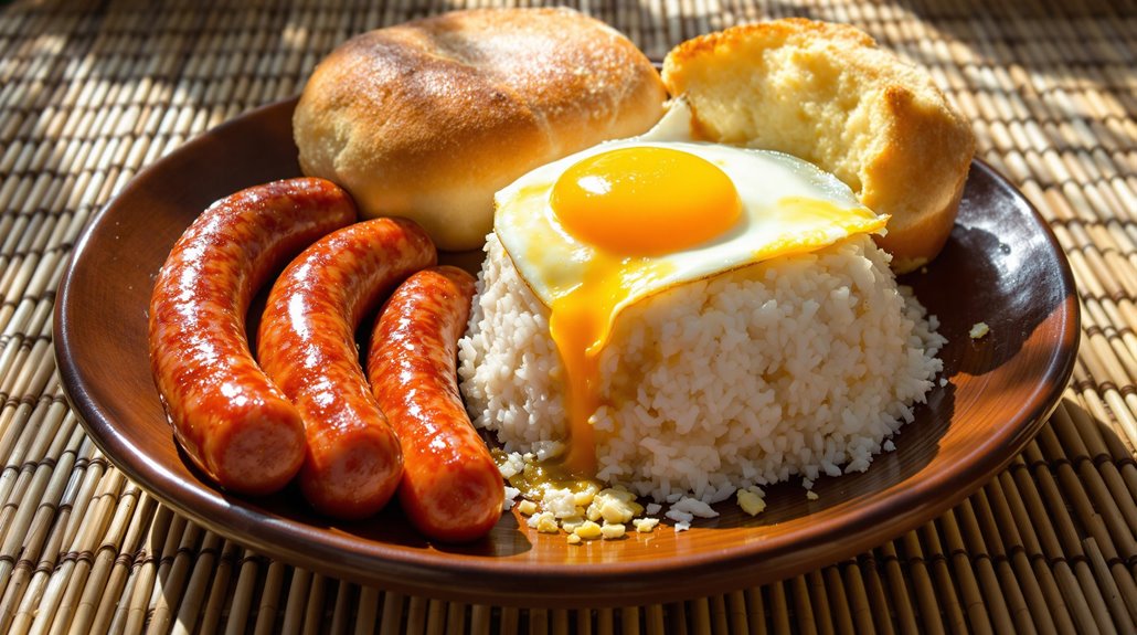 You'll find three iconic elements ruling Filipino breakfast tables: sweet-savory longganisa sausage, garlicky sinangag (fried rice), and warm pan de sal rolls. This hearty combination emerged from practical needs to fuel agricultural workers but evolved into a cherished cultural tradition. Each region puts its own spin on longganisa, while garlic rice and pan de sal remain consistent nationwide favorites. The rich story behind these morning staples reveals centuries of Filipino culinary heritage.