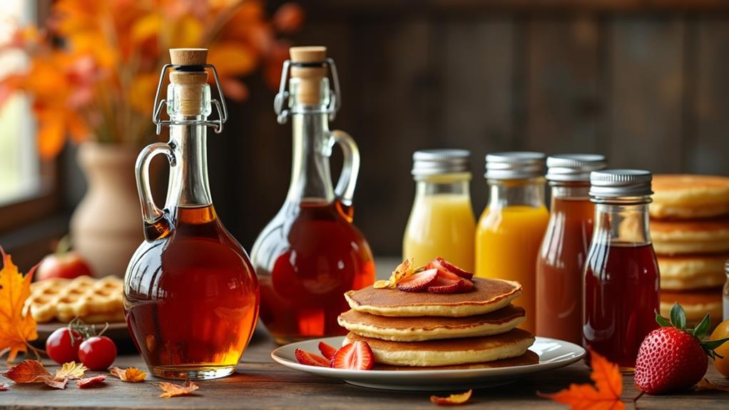 To make healthier and more sustainable choices, consider these five tips when comparing gourmet maple syrup to flavored syrups. Initially, gourmet maple syrup's natural ingredients beat the artificial additives in flavored syrups. Second, its rich flavor complexity outshines the simplistic taste of flavored variants. Third, you'll benefit nutritionally from its minerals and antioxidants. Fourth, it's better for managing blood sugar due to a lower glycemic index. Finally, gourmet maple syrup's sustainable sourcing supports environmentally friendly practices. Investigate these aspects further to improve your culinary experience.