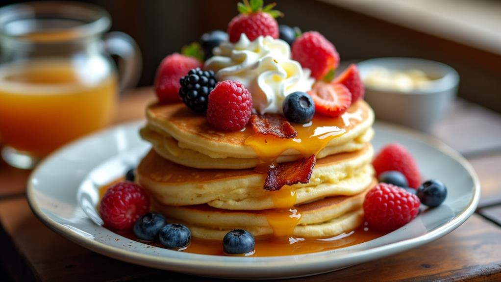 You've got plenty of delicious options for pancake toppings! For a sweet treat, try classic maple syrup, a fresh fruit medley, or indulgent chocolate spread. Whipped cream and berries also make for a delightful dessert-like experience. If you're craving something savory, you can't go wrong with crispy bacon, smoked salmon and dill, or sautéed mushrooms. Nut butter and jam and spicy kimchi add unique, flavorful twists. These combinations can enhance your pancake game effortlessly. Stick around to uncover more on how these toppings can transform your breakfast into a gourmet feast.