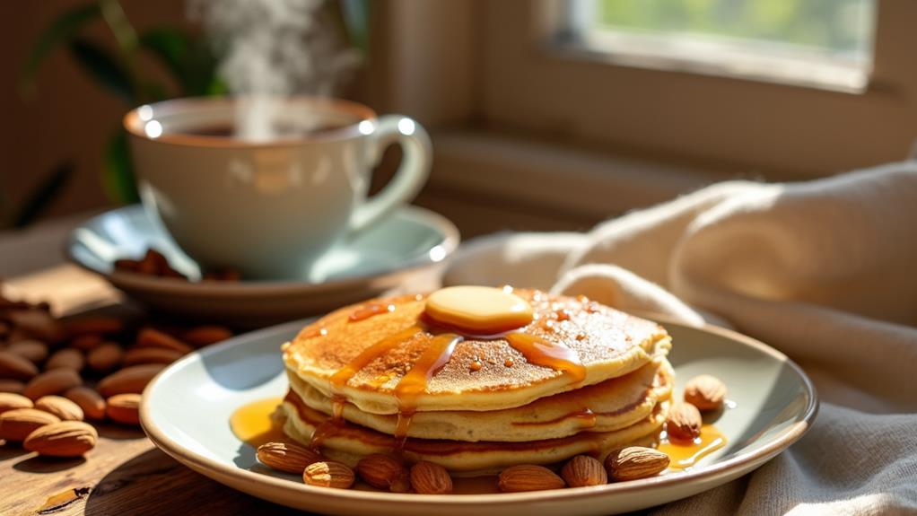 You'll find that almond syrup is perfect for breakfast because it effortlessly blends into hot or cold beverages and sweetens pancakes, waffles, and oatmeal with a delicious nutty flavor. It's easy to make using just sugar, water, and almond extract, so you can whip it up in under 5 minutes. Plus, it has a smooth consistency that avoids gritty sugar crystals, making every bite or sip velvety smooth. Conveniently stored in the fridge, it's always ready to improve your morning routine. There's even more to investigate about its benefits and preparation secrets.