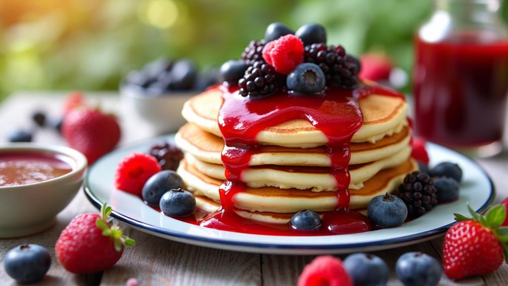 When deciding which syrup is best for pancakes, consider nut syrup benefits. Nut-based syrups like peanut butter or almond butter offer rich flavor profiles without excessive sweetness. They pair well with different toppings and can be used in homemade recipes. Compare their nutritional benefits, such as added protein and healthy fats, against traditional syrups. Remember to check for allergy considerations to guarantee a safe and delicious breakfast.